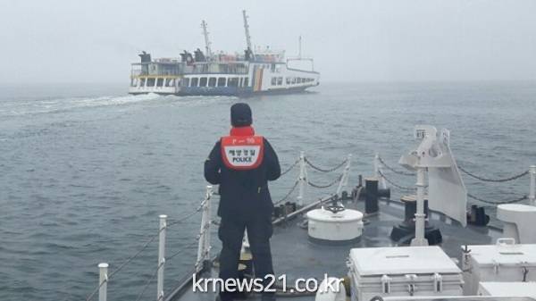 ▲ 스크류에 어망이감겨 운항이 어럽게되자 여객선 예인 호송출동장면