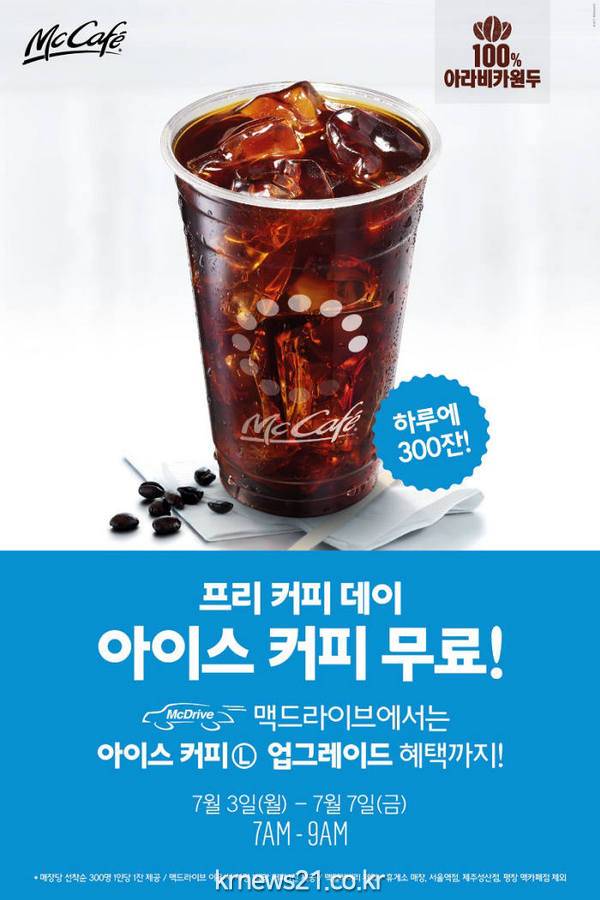 행사 기간 중 매일 오전 7시부터 9시까지 맥도날드를 방문하는 고객 선착순 300명에게 100% 아라비카 원두로 갓 내린 신선한 아이스 커피(미디움 사이즈)를 무료로 제공하는 것. 맥드라이브(드라이브 스루) 이용 고객에게는 라지 사이즈로 업그레이드 혜택까지 제공한다.