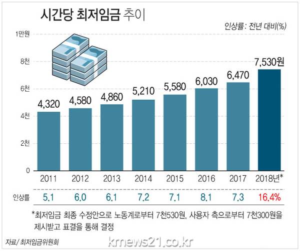 내년 시간당 최저임금이 난항끝에 올해 대비 16.4% 인상한 7,530원으로 결정됐다.