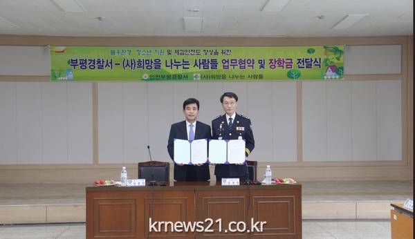 인천부평경찰서(서장 김봉운)에서는 지난 13일(목) 교육복지 후원기관인 사단법인 희망을 나누는 사람들(대표 김정안)과의 업무협약을 체결하고, 부평서 관내 아동복지센터 및 장애학교 등에서 추천받은 학생 10명에게 장학금 및 컴퓨터를 전달했다."고 밝혔다.