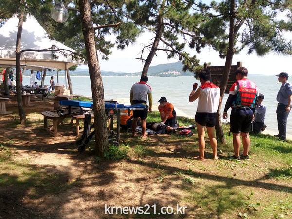 이번 훈련은 민간안전관리요원, 목포해양경비안전서, 무안소방서와 구명보트 1척, 구급차 등을 동원하여 해수욕장 유영구역 안전부표 부근에 익수자가 발생한 상황을 가정하여 익수자 구조훈련을 펼쳤다.