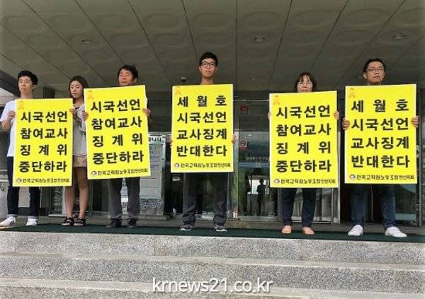 이어 “시국선언 교사들은 새 정부 출범 3개월째를 맞은 지금도 사법·행정 탄압으로 고통을 받고 있다”며 “도교육청이 시국선언 교사에 대한 징계 절차를 진행한다는 것은 참으로 개탄스럽다”고 말했다.