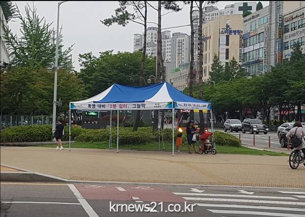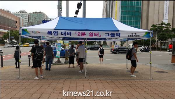 부천시 중4동 행정복지센터에서는 폭염이 기승을 부리는 7·8월을 맞아 나무그늘이 없고 많은 시민이 이용하는 휭단보도 앞이나 교통섬에 신호대기 보행자를 위하여 폭염 대비『2분쉼터』그늘막 설치를 통한 작은 배려로 시민안전 우선시책에 나섰다.