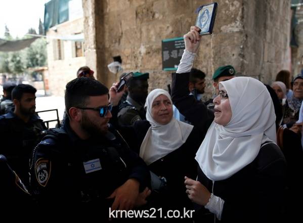 ▲ AFP / AHMAD GHARABLI[제공자ⓒ 뉴스21통신. 무단전재-재배포 금지.]팔레스타인 시위대가 '코란'을 들고 예루살렘 구시가지에서 시위도중 이스라엘 보안군 앞에서 구호를 외치고 있다. 이스라엘 당국이 동예루살렘의 성지인 템플마운트 입구에 금속탐지기를 설치한 이후 이스라엘과 팔레스타인 간 갈등이 고조되고 있다.