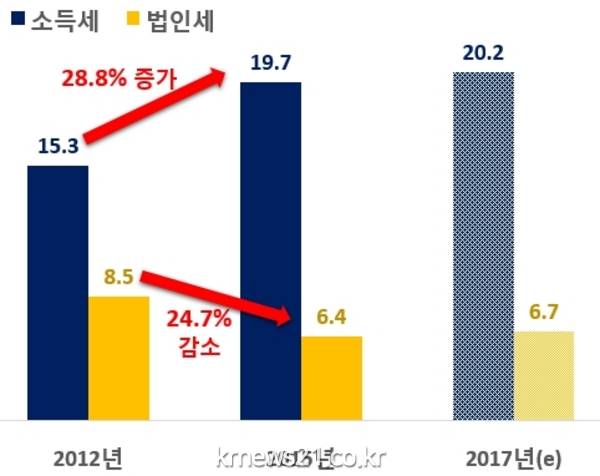 2015년 개인 조세감면은 24조4천억원으로 2012년보다 14.5% 증가했으나 기업은 2015년 10조8천억원을 기록하며 1.8% 줄었다.