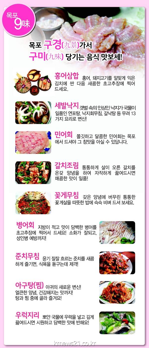 시는 먹거리를 각인시키기 위해 브랜드 네이밍에 힘을 쏟고 있다. 대외 인지도 상승을 위해 대표음식을 세발낙지, 홍어삼함, 민어회, 꽃게무침, 갈치조림 등 기존 5미(味)에 병어회, 준치무침, 아구탕(찜), 우럭지리 등을 추가해 9미(味)로 확대했다. 이를 토대로 ‘목포로 구경(九景)가서 구미(九味) 당기는 음식 맛보세‘라는 슬로건으로 관광 마케팅을 펼치고 있다. 구(9)경은 유달산, 목포대교, 갓바위, 춤추는 바다분수, 노적봉, 목포진, 이난영 공원, 다도해, 외달도 등이다.