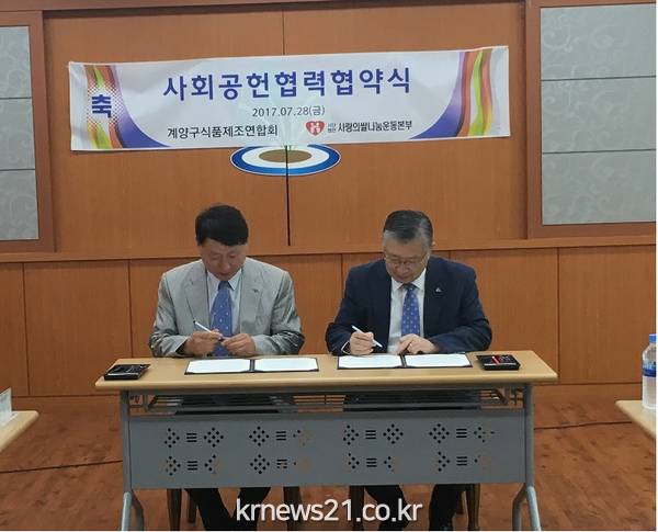 인천 계양구식품제조연합회는 지난 28일 (사)사랑의 쌀 나눔운동본부와 사랑의 빨간밥차 운영지원을 위한 사회공헌 업무협약을 체결했다.