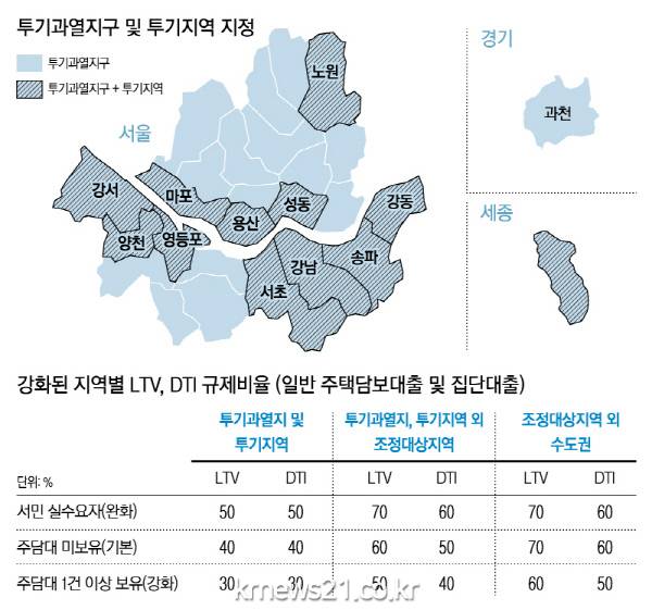총부채상환비율(DTI)ㆍ담보인정비율(LTV)도 모두 40%까지 강화한다. 2015년 폐지한 ‘주택거래신고제(3억원 이상 주택 거래 시 자금조달 계획 및 입주계획 신고)’도 적용된다. 투기지역은 여기에다 다주택자 양도소득세 중과, 주택담보대출 건수 차주당 1건에서 가구당 1건으로 제한 등 규제가 추가된다. 해당지역에 3일부터 바로 적용할 예정이다.