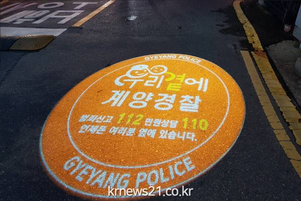 계양서는 로고젝터를 활용해 ‘우리곁에 계양경찰’ 등을 알리는 캘리크라피 문구이미지를 매일 오후 7시부터 다음날 오전 5시까지 경찰서 정문 바닥에 투영하여 계양경찰을 홍보할 방침이다.