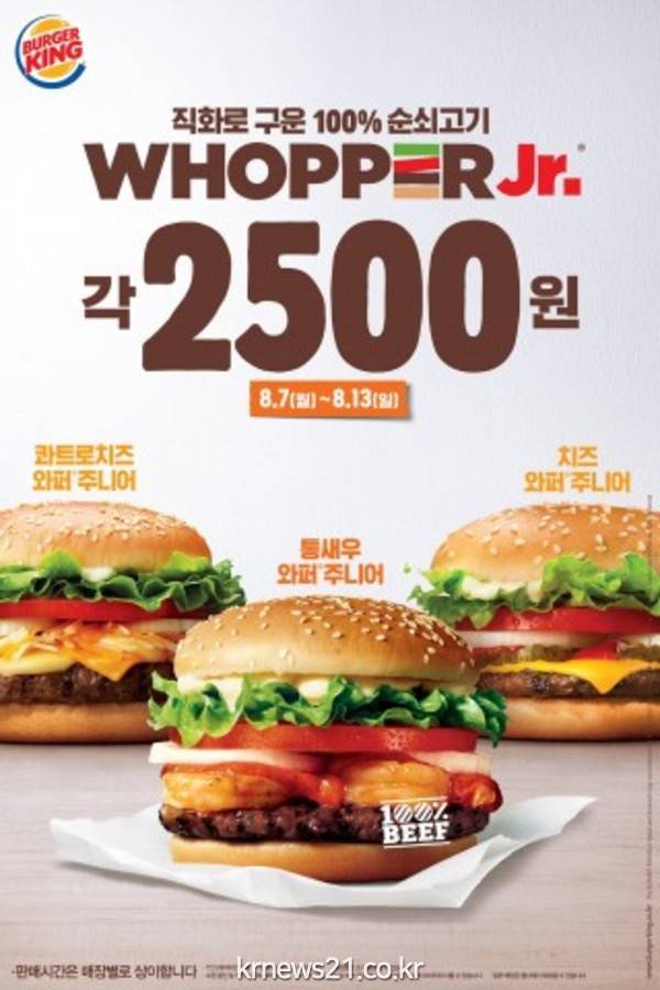 프리미엄 햄버거 브랜드 버거킹이 7일부터 13일까지 인기 프리미엄 와퍼 주니어 3종 단품을 각 2500원에 할인 판매한다.