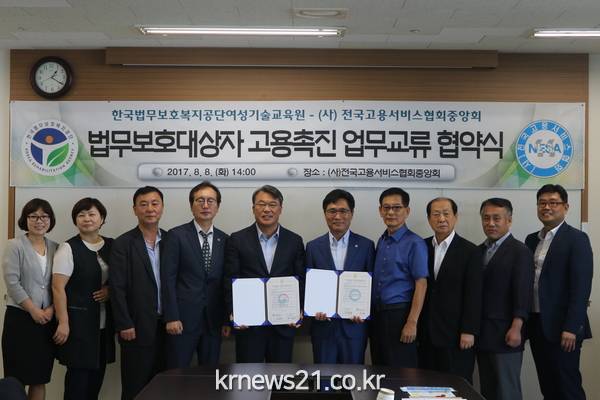 한국법무보호복지공단 여성기술교육원(원장 김덕환)과 (사)전국고용서비스협회중앙회(회장 원택용)는 2017. 8. 8 (화) 14:00 전국고용서비스협회중앙회 회의실에서 여성보호대상자의 고용촉진과 안정적인 일자리 창출을 위한 업무협약(MOU)을 체결하였다.