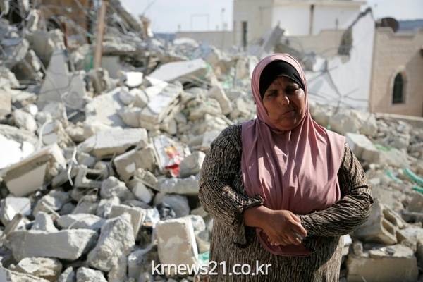 ▲ AFP / ABBAS MOMANI[제공자ⓒ 뉴스21통신. 무단전재-재배포 금지.]팔레스타인 자치정부 임시 행정수도인 라말라 인근 마을을 이스라엘 군대가 공격한 가운데 한 팔레스타인 여성이 무너진 건물 앞에 서 있다.