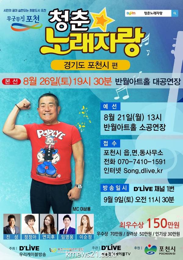 딜라이브(D‘LIVE) 케이블방송의 인기프로그램인 ‘청춘노래자랑'은 지역 내 모든 연령층의 일반시민들을 대상으로 열리는 오디션 프로그램으로 오는 26일 (토) 저녁 7시 30분 반월아트홀 대공연장에서 공개녹화방송으로 진행된다.