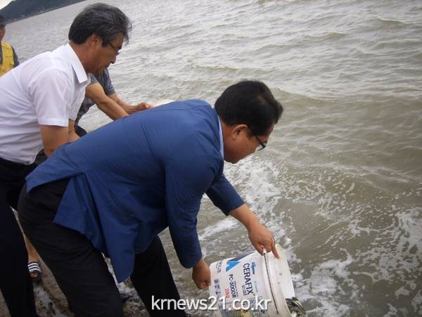 김포시(시장 유영록)가 지난 14일 농업기술센터소장, 농정과장, 경인북부수협장, 한강어촌계장 등 30여 명이 참석한 가운데 황복 치어 50만 마리를 한강(양촌읍 누산포구)에 방류했다.