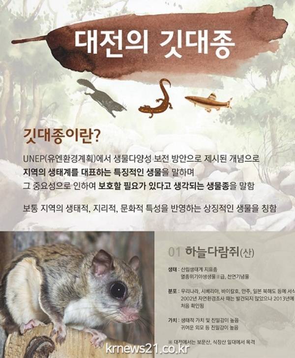 대전시는 2014년 시민 공론화 과정을 거쳐 우리시 대표 생물인 하늘 다람쥐, 이끼 도롱뇽, 감돌고기 3종을 깃대종으로 선정하였고, 2016년에는 전문연구기관에 의뢰해 깃대종 보존대책을 수립한 바 있다.
