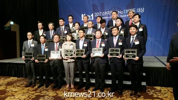 사진설명 : 지난 18일 서울 밀레니엄 서울 힐튼호텔에서 열린 ‘2017 소비자평가 NO. 1 브랜드대상’ 시상식 모습. 강진군은 농·특산물 부문에서 대상을 받았다. 강진군은 이형동 기획홍보실장(아랫줄 오른쪽부터 세 번째)이 참석해 수상했다.