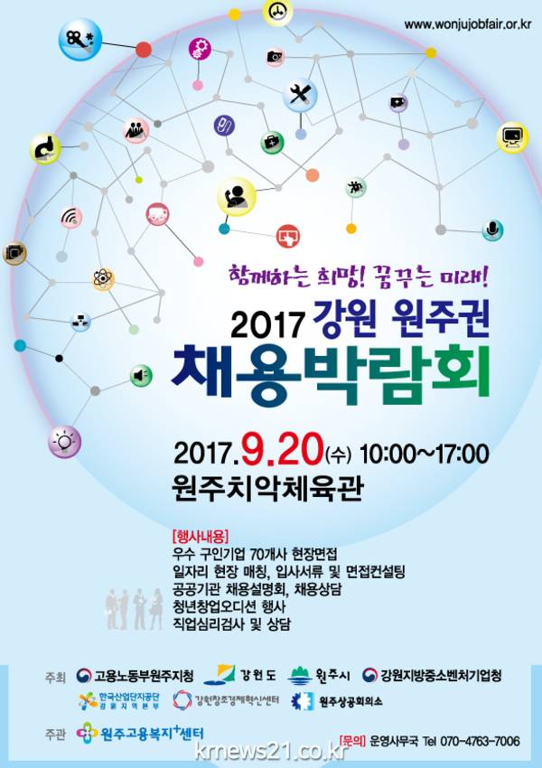 고용노동부 원주지청은 오는 9월20일 원주치악체육관에서 청년 구직자의 일자리 제공을 위해 2017원주청년채용박람회를 개최한다고 24일 밝혔다.