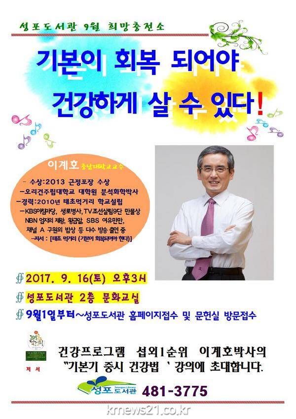 안산시 성포도서관은 오는 9월 16일 오후 3시에 건강 전문 프로그램 섭외 1순위의 인기 강사인 충남대 이계호 교수를 초청해 ‘기본기 중시 건강법’에 대한 강연을 진행한다.