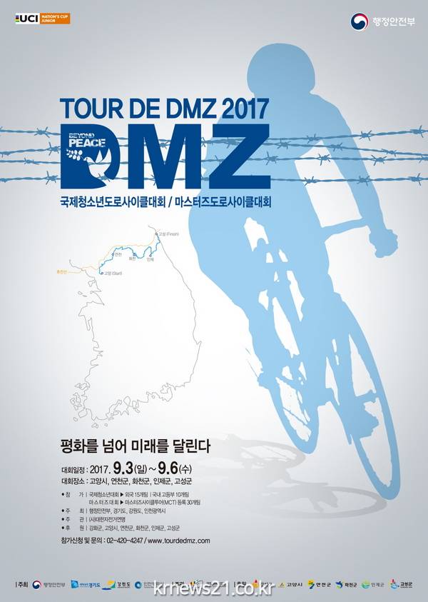 내달 2일부터 6일까지 비무장지대(DMZ)와 접경지역에서 진행되는 ‘2017 Tour de DMZ 국제자전거 대회’는 행정안전부, 경기도, 인천광역시, 강원도가 공동주최하고 대한자전거연맹이 주관하며 ‘제2회 국제청소년 도로사이클대회’와 ‘강화자전거투어’ 및 ‘대한자전거연맹 마스터즈 대회’로 구성된다.