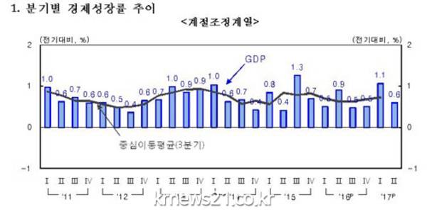 1일 한국은행이 발표한 '2017년 2분기 국민소득(잠정)'에 따르면 올해 2분기 국내총생산(GDP)은 386조5825억원으로 지난 1분기보다 0.6% 성장했다. 이는 지난 7월 발표된 속보치와 같은 수치다. 지난해 같은 기간보다는 2.7% 상승했다.