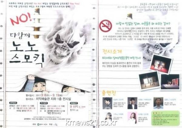 원주시보건소는 9월 6일부터 9월 19일까지 치악예술관 지하 1층 전시실에서 “담배는 왜 우리 몸에 해로울까요?” 등의 주제로 흡연예방 어린이 음악극 “다함께 노노! 스모킥!”을 공연한다.