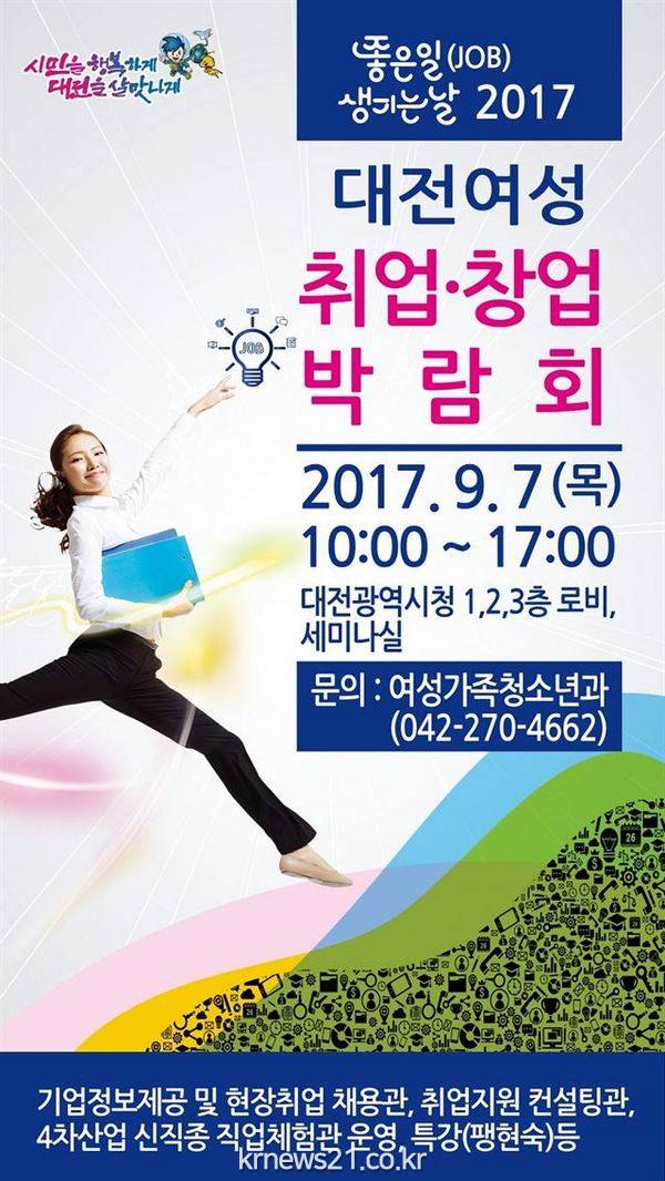 대전시는 ‘2017 대전여성 취업ㆍ창업 박람회’를 7일 대전시청에서 개최한다고 4일 밝혔다. ‘좋은 일(Job), 생기는 날’을 주제로 열리는 박람회에는 150개 지역 기업이 참가한다.