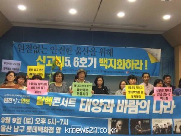 오는 9일엔 신고리 5·6호기 백지화 울산시민운동본부와 부울경 탈핵연대 등이 울산문화예술회관과 롯데백화점 울산점 앞에서 신고리 백지화를 위한 전국 탈핵 대회를 연다. 이들 단체는 “울산과 부산, 경남에는 이미 세계 최대 다수의 핵발전소가 있다. 활성지진대 역시 많아 핵발전소 2개를 더 짓는 것은 후손들에게 재앙 덩어리를 물려주고자 하는 것”이라며 탈핵을 강력히 주장하고 있다.
