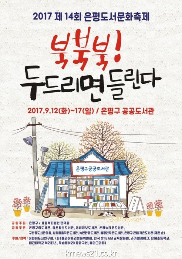 은평구립도서관, 구립증산정보도서관, 구립응암정보도서관, 구립은평뉴타운도서관, 구립구산동도서관마을, 상림마을작은도서관, 녹번만화도서관, 불광천작은도서관, 및 은평구 관내 작은도서관에서는 9월 12일(화)부터 17일(일)까지 제14회 2017 은평도서문화축제를 개최한다.