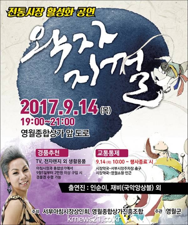 강원영월군(군수 박선규)은 5회째를 맞이하는 '2017 영월국제박물관포럼'을 기념하여 9월 14일(목) 19시부터 종합상가 앞 도로에서 왁자지껄 전통시장 공연을 개최한다고 밝혔다.