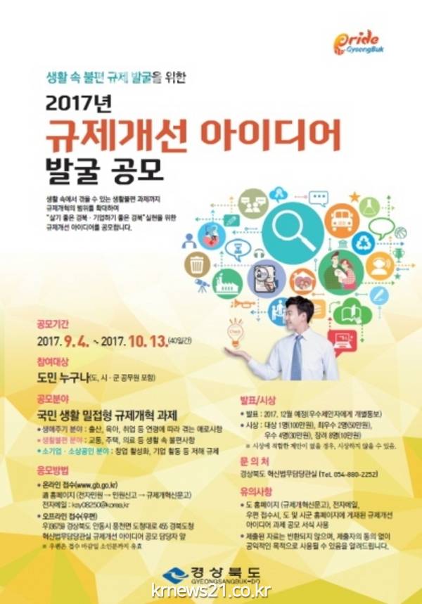 영덕군에서는 내달 13일까지 경상북도에서 실시하는 ‘2017 규제개선 아이디어 발굴 공모’에 많은 군민들의 참여를 당부했다.