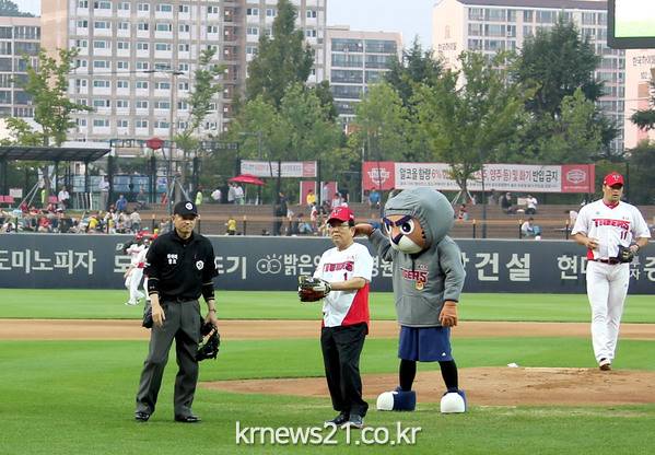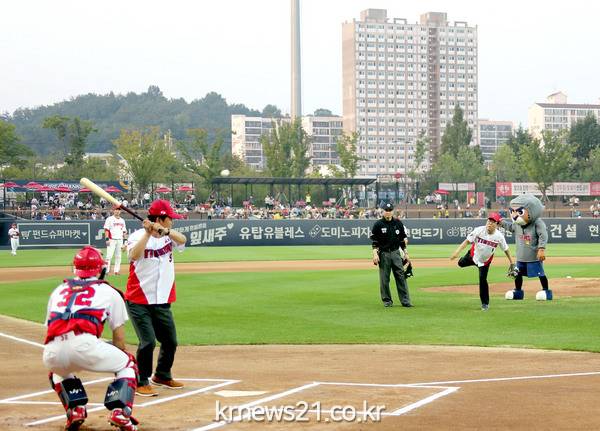 김준성 영광군수가 지난 7일 광주 기아챔피언스필드에서 열린 KIA 타이거즈와 한화 이글스 경기에서 제17회 불갑산상사화축제 성공 개최를 기원하는 시구 홍보를 펼쳤다.