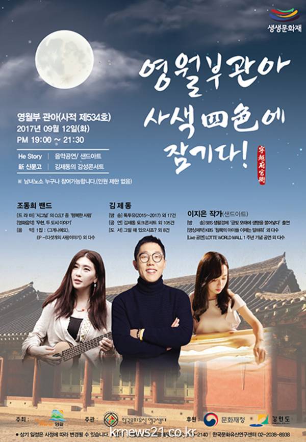프로그램은 오는 12일 영월부 관아에서 오후 7시~오후 9시 30분까지 진행되며 1부에서는 샌드아트 작가 이지은, 조동희가 출연하고 2부에는 ‘국민 MC’ 김제동이 ‘新신문고‘를 진행한다.