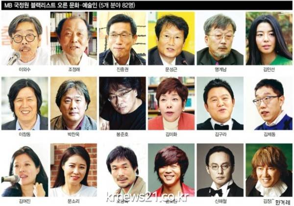 문화계에서는 탁현민 청와대 선임행정관, 이외수, 조정래, 진중권, 김명곤씨 등 6명, 배우 중에선 문성근, 명계남, 김민선(김규리)씨 등 8명, 영화감독은 이창동, 박찬욱, 봉준호 등 52명, 방송인은 김미화, 김구라, 김제동 등 8명, 가수로는 윤도현, 고 신해철, 김장훈 등 8명이 각각 퇴출명단에 포함됐다.