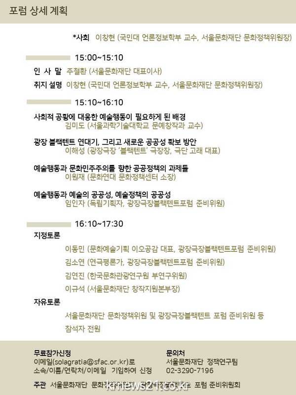 서울문화재단(대표이사 주철환)이 서울문화재단 문화정책위원회(위원장 이창현)와 광장극장블랙텐트 포럼 준비위원회가 공동 주관하는 ‘광장 민주주의와 예술행동 그리고 문화예술정책의 공공성’ 정책포럼을 15일(금) 오후 3시 시민청 바스락홀에서 개최한다.