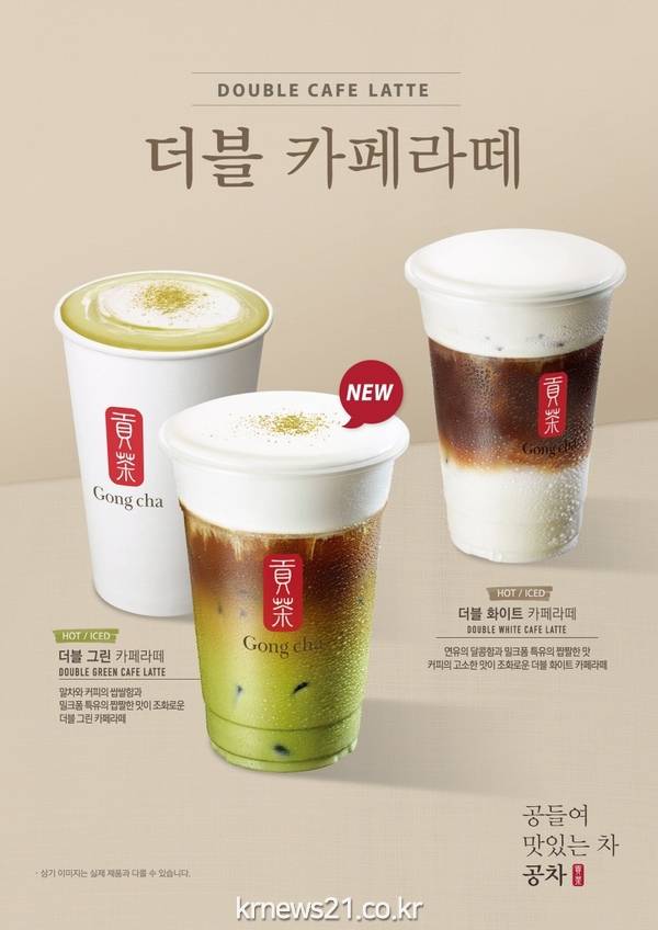 한편, 이번 신 메뉴인 더블 그린 카페라떼와 함께 공차를 대표하는 커피 메뉴인 더블 화이트 카페라떼는 연유의 달콤함과 밀크폼 특유의 짭조름한 맛, 커피의 고소한 맛이 조화 이루는 메뉴로 2016년 출시 이래 꾸준한 사랑을 받고 있다