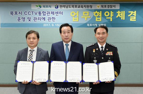 목포시(시장 박홍률)가 지난 15일 시청 상황실에서 전라남도목포교육지원청(교육장 박선미), 목포경찰서(서장 최인규)와 ‘목포시 CCTV통합관제센터 운영 및 관리에 관한 업무협약’을 체결했다.