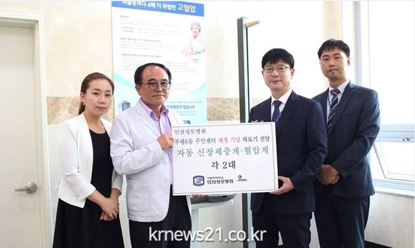 가톨릭대학교 인천성모병원은 최근 부평6동 주민센터의 신청사 개청을 축하하며 혈압계 및 자동 신장체중계 각 2대씩을 부평6동에 기증했다.'고 밝혔다.