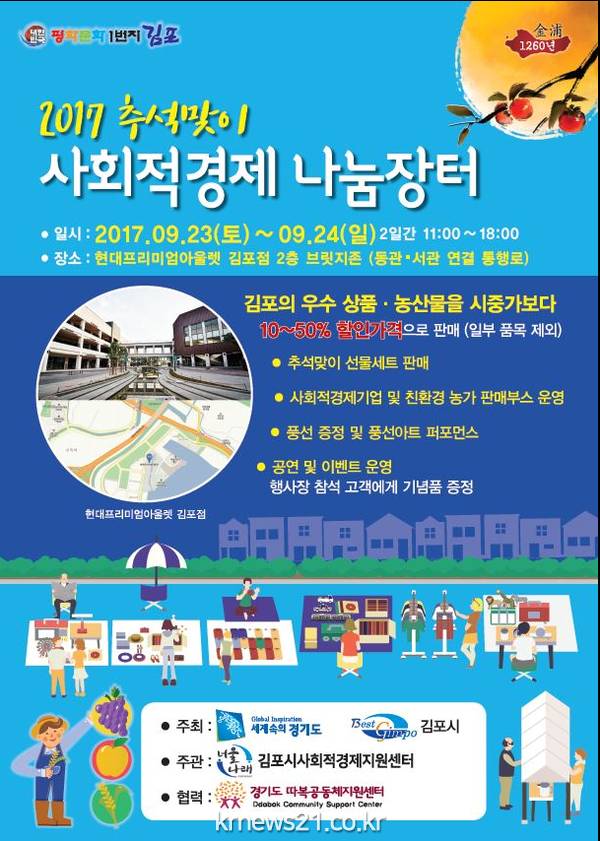 김포시(시장 유영록)가 오는 9월 23~24일 오전11시 ~ 오후6시까지 현대프리미엄아울렛 김포점에서 ‘2017 추석맞이 사회적경제 나눔장터’를 개최한다."고 밝혔다.