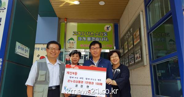 인천시 계양구 계산4동 보장협의체 윤장현 위원은 20일 추석맞이 ‘계양구 행복나눔 연합모금’에 동참하여 온누리상품권 100매(환가액 100만 원)를 계산4동 보장협의체에 기탁했다.