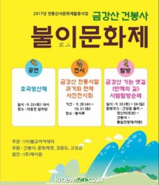 사단법인 불교아카데미 금강산불이문화사업단이 주최하고 문화재청과 건봉사, 강원도, 고성군이 후원하는 이번 축제는 '만해의 길, 금강산 가는 옛길 탐방행사'를 비롯해 '금강산 전통사찰 사진전시회', '호국 영산재' 등으로 꾸며진다.