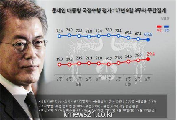 여론조사 기관 리얼미터가 CBS 의뢰로 18~22일 성인 2533명을 상대로 조사해 25일 발표한 9월3주차 주간집계에 따르면 문 대통령에 대한 국정수행 지지도는 지난주 대비 1.5%p 하락한 65.6%(매우 잘함 42.7%, 잘하는 편 22.9%)로 나타났다.