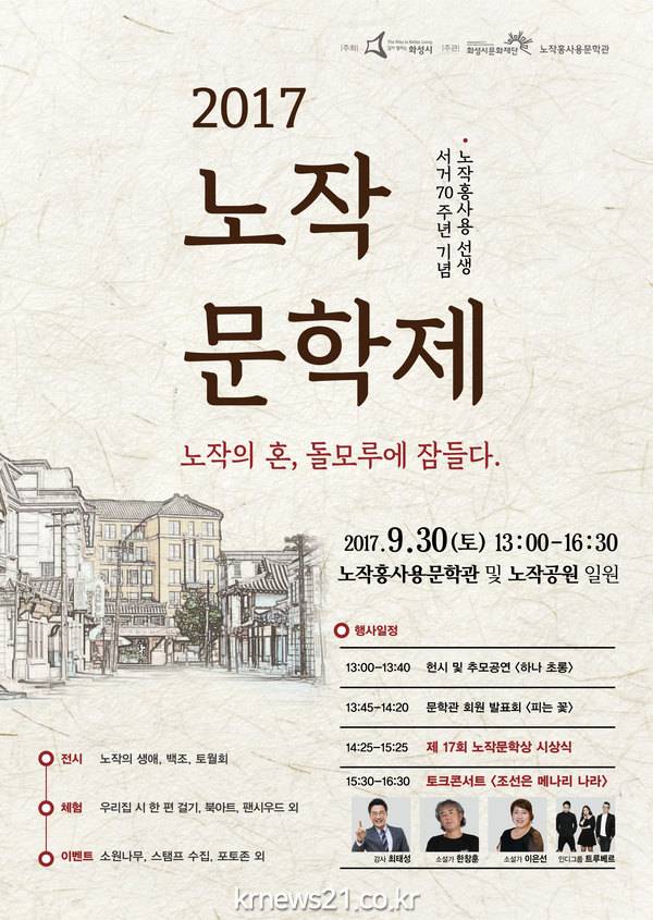 (재)화성시 문화재단 노작홍사용문학관에서 오는 9월 30일 토요일에 <2017 </span>노작 문학제>를 개최한다. <</span>노작 문학제>는 동인지 ‘백조’ 창간에 참여하고 극단 ‘토월회’를 이끌었던 노작 홍사용 선생을 기리며, 시민들이 참여하고 즐기는 문학축제로 올해는 홍사용 선생의 서거 70주년을 맞아 헌시 및 추모공연 ‘하나 초롱’과 회원들의 발표회 ‘피는 꽃’, 본행사인 ‘제17회 노작문학상 시·희곡부문 시상식’, 행사의 대미를 장식하는 토크 콘서트 ‘조선은 메나리 나라’까지 3개의 파트로 진행된다.