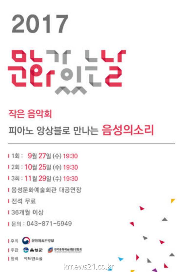 문화체육관광부가 주최하고 음성군과 한국문화예술회관연합회가 주관하는 이번 공연은 전석 무료로 진행된다.
