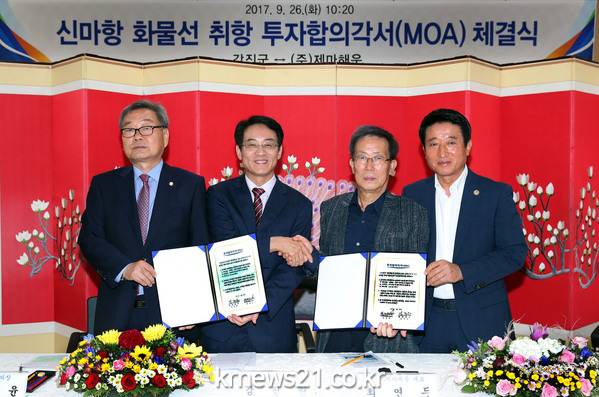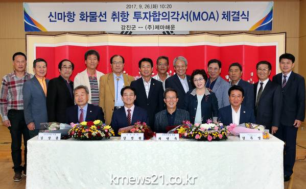 26일 강진군과 ㈜제마해운에 따르면 이날 오전 강진군청 대회의실에서 강진원 강진군수와 제마해운 최연두 대표, 김상윤 강진군의회 의장 등이 참석한 가운데 ‘신마항 화물선 취항을 위한 투자합의각서(MOA) 체결식’을 가졌다.