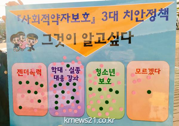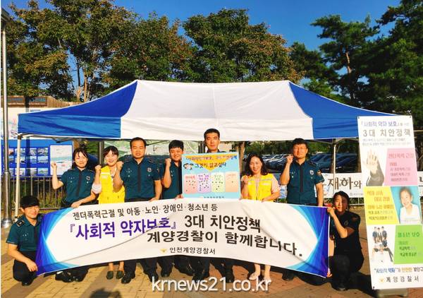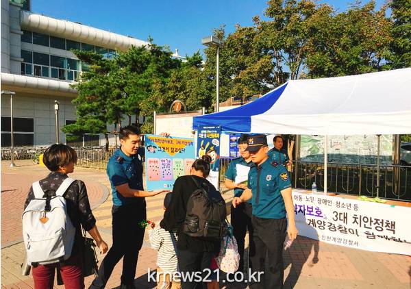 인천계양경찰서(서장 정진관)에서는 지난 22일 계양경찰서·계양폴리스맘 등 20여 명이 참석한 가운데, 계양역 광장에서 ‘사회적약자보호 3대 치안정책’ 홍보캠페인을 실시했다."고 밝혔다.