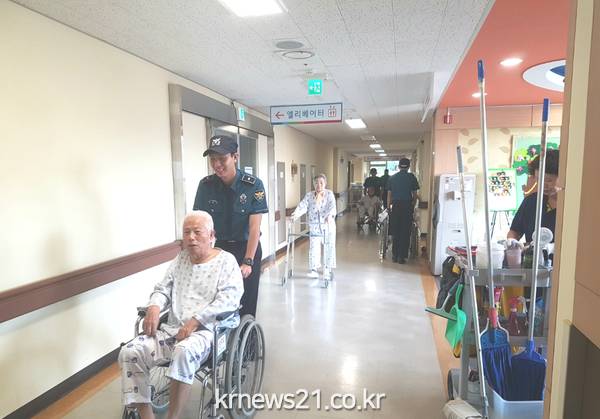 부천오정경찰서(서장 김기동) 112 타격대 의무경찰은, 28일(목) 부천시 작동 소재 ‘부천시립요양원’ 을 찾아 봉사활동을 통하여 사회적 약자에 대한 배려심을 키워주는 등 친절하고 따뜻한 경찰 이미지를 심었다.