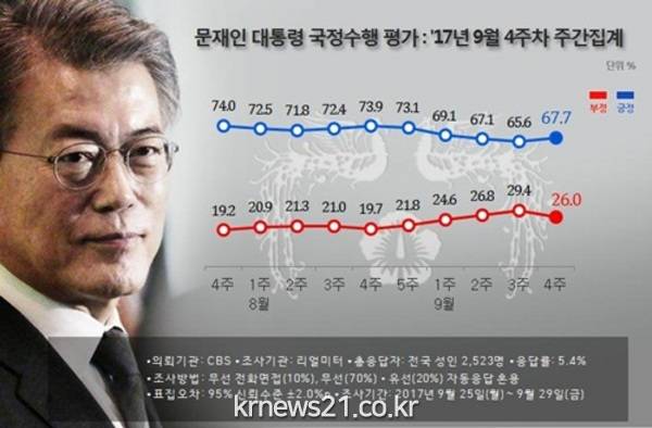 문재인 대통령의 국정지지율이 소폭 올라 70%에 육박했다는 여론조사 결과가 발표됐다.
