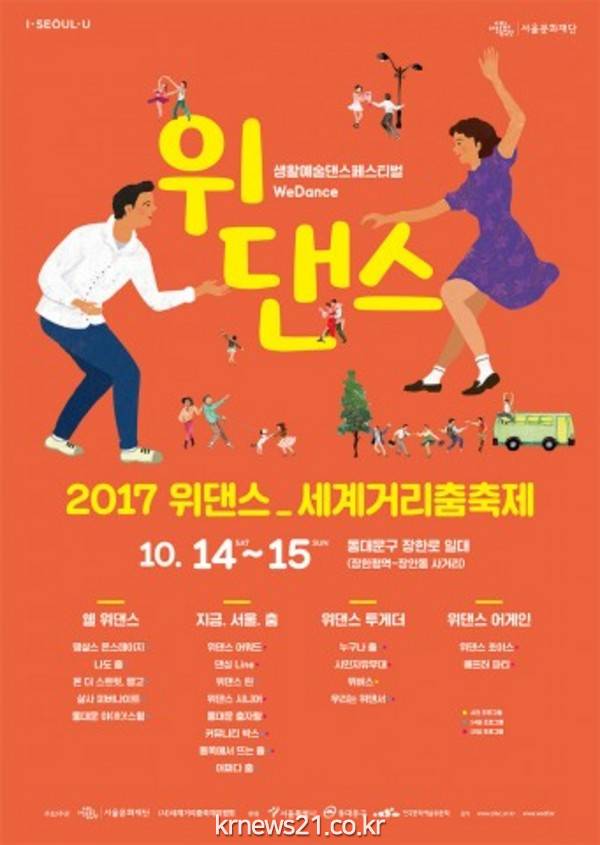 서울문화재단(대표이사 주철환)이 생활예술 ‘춤’ 축제인 <2017 위댄스 세계거리춤축제>를 14일(토), 15일(일) 양일간 동대문구 장한로 일대에서 개최한다고 밝혔다.