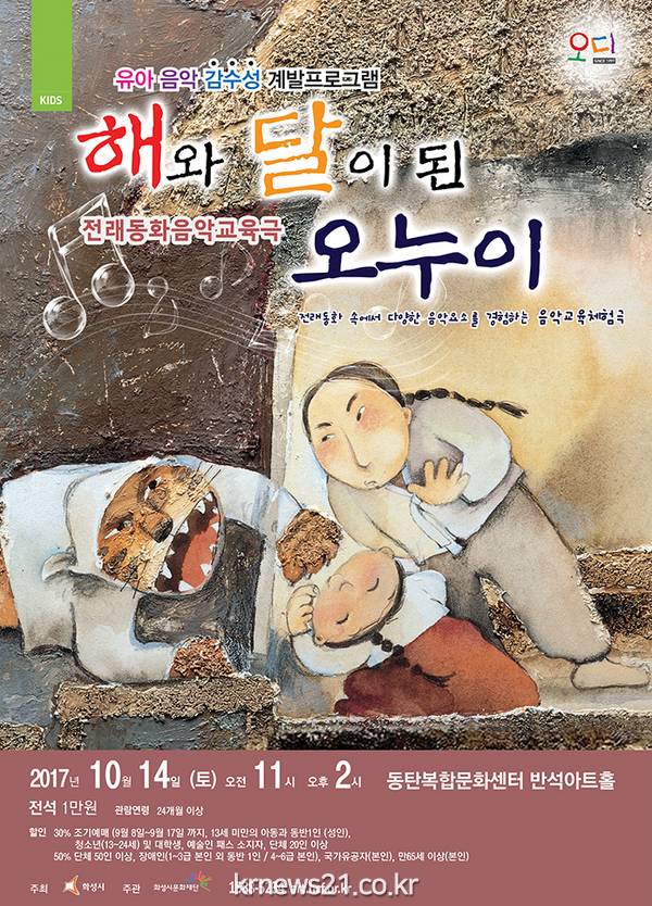 화성시 문화재단이 10월 14일 토요일 동탄 복합 문화센터 반석아트홀에서 오디에이션 아동극 <</span>해와 달이 된 오누이>를 선보인다. 오디에이션(Audiation)이란 음악을 마음속으로 듣고 이해하며 상상할 수 있게 하는 음악의 내면화 능력을 일컫는다.