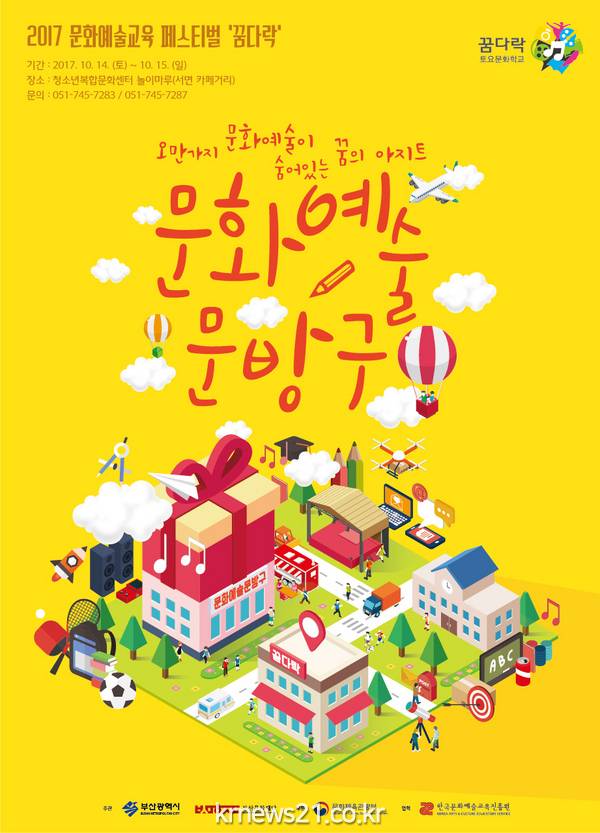 부산문화재단은 오는 14~15일 부산진구 청소년 복합문화센터 놀이마루에서 2017 꿈다락 토요문화학교 문화예술교육 페스티벌을 개최한다.